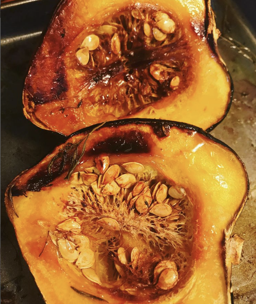 Such a simple whole-food meal on this cold Halloween evening - baked acorn squash. Cut in half, grease with